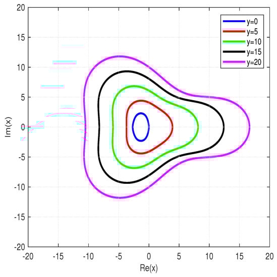 We say that fixed point is stable if []. When a numerical method is applied to (31), the regions of stability are determined by taking into account the ratio . For this, we assume that and , where k is the time step size.