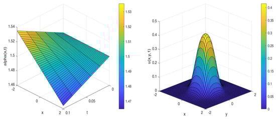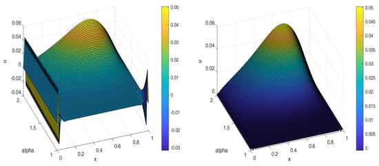 In this section, we provide the space derivative approximation of Equation (1). Suppose that and are integrable in . Consider the spatial discretization: , with and , with . Then for every , the variable-order Riemann–Liouville fractional derivative exists and coincides with the Grünwald–Letnikov derivative. The relationship between the Riemann–Liouville and Grünwald–Letnikov definitions also plays an essential role in the numerical approximations of fractional differential equations, the manipulation of fractional derivatives, and the formulation of physically meaningful initial-value and boundary-value problems for fractional differential equations. As a result, the Riemann–Liouville definition can be used to formulate the problems, and the Grünwald–Letnikov definition can then be applied to arrive at a numerical solution. The left and right variable-order Grünwald–Letnikov fractional derivatives [] are defined as follows: