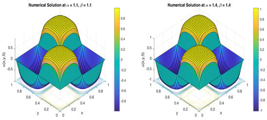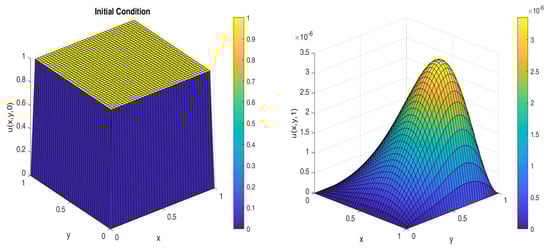 where is the error between consecutive solutions corresponding to time steps and k. This approach is used to compute the order of convergence when analytical solutions are not available; see, for example, [,]. Convergence errors are computed using the norm and norm. The computational efficiency of the new method is shown by recording the CPU time for each iteration and is given in the convergence tables. It can be seen that the CPU time is very small even with a large number of time steps. All the calculations are performed using Matlab version R2020b on an Intel Core i7 CPU with 4.0 GHz of speed and 32 GB RAM.