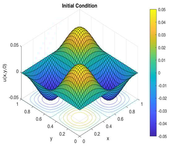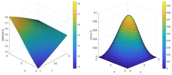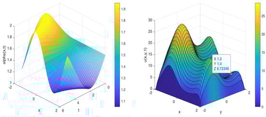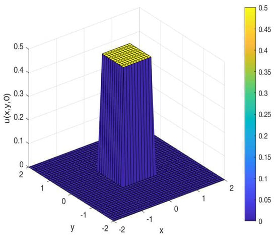 In this section, we compute and discuss the solutions obtained by applying the new method to three well-known practical test problems, an enzyme kinetics equation, the Fisher equation, and the Allen–Cahn equation. The stability region of the proposed method is shown in Figure 1. First, we solve these first two problems in one dimension and plot the solutions at for each . The surface plots given in Figure 2 and Figure 3 show the behaviors of the solutions at corresponding to fractional derivatives of variable-order . Figure 4 shows the solution profiles of Section 5.1 using ETD Crank–Nicolson scheme at with 80 time and 160 time steps. Because of the A-stability of the ETD Crank-–Nicolson scheme, unwanted oscillations occur in the solution profile when initial data are non-smooth. Since the initial data are not smooth in Section 5.1 due to mismatched initial and boundary conditions, unwanted oscillations can be seen in the solution profiles shown in Figure 4. These oscillations reduce in magnitude by decreasing the time-step size. But this makes the scheme computationally more expansive. The graph of the initial condition of Section 5.2 is showing in Figure 5. Note that the graph of the solution profile in Figure 3 is rotated to make it more visible. Next, we solve the same problems in two dimensions and plot the solutions at corresponding to the fractional derivatives of variable orders and with . For simplicity, functions and are taken as the same in Problem Section 5.2. Their graphs are the same as the graph of given in Figure 2. The graphs of in Section 5.4 are the same as the graphs of in the same problem. The effects of the variable-order fractional diffusion are shown in the graphs of the solution profiles. The graphical behaviour of the initial condition used in Section 5.4 can be see in the Figure 6. The solution profiles of the Section 5.4 are computed at different times are shown in the Figure 7, Figure 8 and Figure 9. The initial condition of Section 5.5 is plotted in the Figure 10. Numerical solutions of the Allen–Cahn Section 5.5 are computed at for various values of . These graphs are shown in Figure 11.