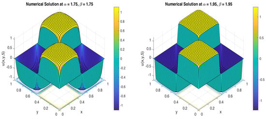 5.4. Space Variable-Order Fractional Fisher Equation in Two Dimensions