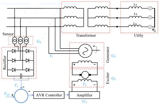 The complete first-order TF modeling of AVR components is shown in Figure 2. The complete system’s TF representing the output to input TF can be expressed as follows: