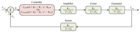 Schematic structure of AVR control schemes. (a) PID controller; (b) FOPID controller.