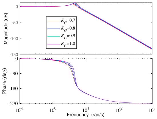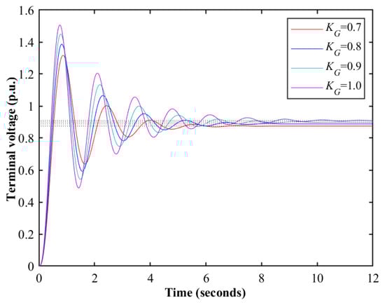 The considered parameters’ values (1) are as follows: , , , , , , , and [], whereas the generator’s gain depends on its loading level. At the no-load condition, equals 0.7, and it increases with loading to 1 at the nominal loading condition []. In this section, the analysis of the AVR system without the controller is carried out. Figure 3 shows different step responses of AVR systems at various loading conditions (varying at 0.7, 0.8, 0.9, and 1.0). The associated frequency response and the root locus plots of the effects of different loading conditions are shown in Figure 4 and Figure 5, respectively. It can be seen that the generator’s gain affects the system response in step time, the frequency response, and the root locus pole/zero locations.