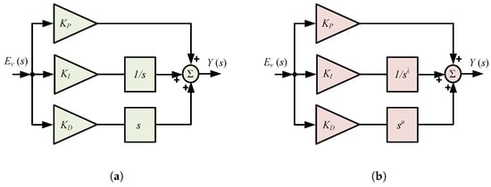 Figure 6 shows the schematic diagrams of PID- and FOPID-based AVR systems. It can be seen that the PID possesses three tunable gains, whereas the FOPID possesses five different tunable parameters. The FOPID has three gains and two FO operators, which increase its flexibility and degree of freedom compared to IO-based PID controller. The parameter optimization process is highly dependent on the objective function employed to drive the optimizer algorithm. The controller parameters are selected to minimize the predefined objective function. Usually, the measured output voltage and/or the error signals are used for constructing the objective functions.
