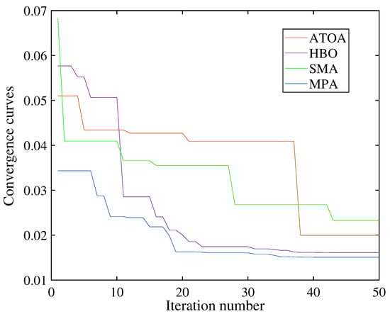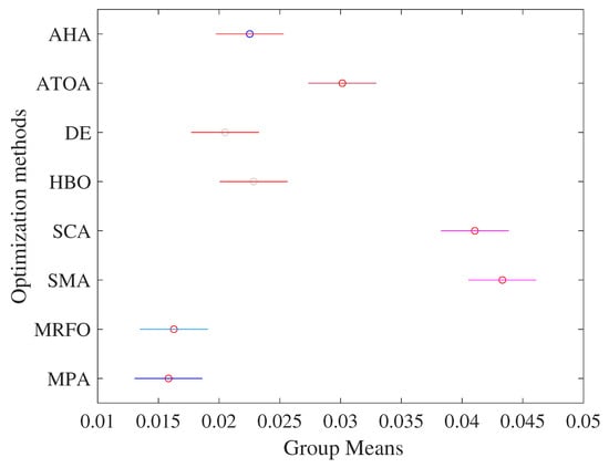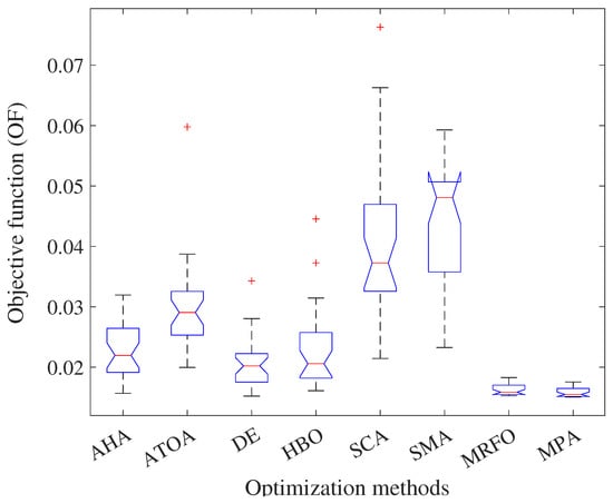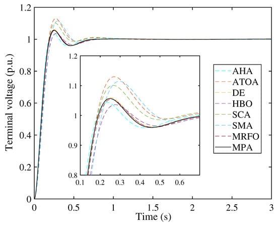 Firstly, comparisons of the performance of MPA optimizers was performed with optimizers featured in the literature recently. The considered optimizers include the Artificial Hummingbirds Algorithm (AHA) [], arithmetics trigonometric optimizer algorithm (ATOA) [], Differential Evolutions (DE) [], Heap-Based Optimization (HBO) [], Sine–Cosine Optimizer Algorithm (SCA) [], Slime Mould Algorithm (SMA) [], and Manta Ray-Foraging Optimization (MRFO) []. The proposed AVR controller and optimization algorithms are simulated using MATLAB R2021a software. The AVR system and controller are implemented in Simulink and linked with the m-file program, which contains the optimization algorithms. The optimization process is made 30 times using the same number of iterations, population size, and parameters limits. The obtained results over the 30 runs are summarized in Table 4.
