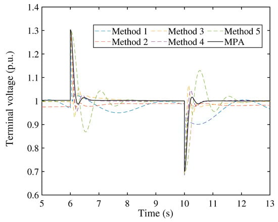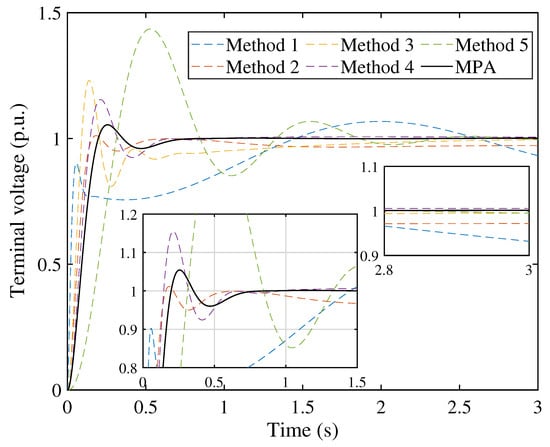 Fortunately, voltage deviations can be properly controlled, and their effects consequently mitigated. The voltage can be regulated at various existing levels in power systems on the generation side, and/or on the transmission/distribution sides. On the generation side, automatic voltage regulators (AVRs) are employed for controlling voltage deviations [], whereas on the transmission/distribution sides, various existing reactive power compensation devices can be utilized, such as flexible AC transmission systems (FACTS), transformers’ tab changers, filter devices, etc. The AVR systems have verified excellent regulation performance on the generation sides of synchronous generators. Optimized design of AVR parameters is essential for obtaining the best performance of these devices, considering the various uncertainties and parameter variations in AVRs, sensors, gains, etc. [].