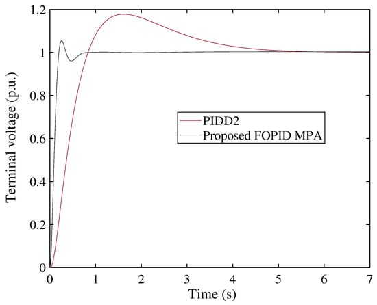 The integer order (IO) schemes have found wide use in AVR applications, especially the PID control scheme. It has proven better dynamic response and more stable performance, owing to its robustness and simple implementation. However, restrictions exist in the use of PID control schemes in modern control and industrial applications, due to their performance’s dependency on and sensitivity to the gains’ value-selection process []. Trial-and-error tuning has been presented in the literature; however, it consumes more time without ensuring an optimum control-parameter selection process. Diverse traditional tuning methods for PID controllers exist in the literature, such as the Ziegler–Nichols and Cohen–Coon methods. However, they are based on selecting a particular operating point for the tuning process when linearly evaluating the model. This, in turn, leads to the incapability to drive optimum gains and high overshoot peaks, and, accordingly, long oscillations exist in the system [].