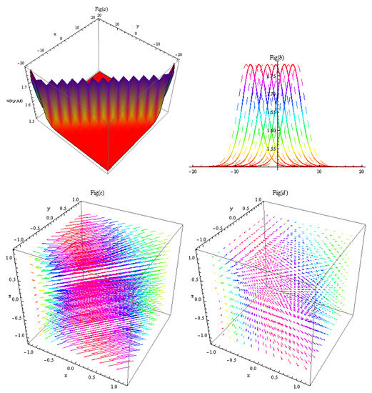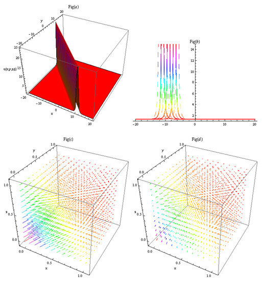 In Figure 5, by setting parameters to appropriate values, result (54) is obtained and illustrated. Figure 5a depicts the bright multi-peak solitons, (b) their 2D cross-section, and (c,d) their electric field and magnetic field , respectively. By setting parameters to appropriate values, the result (58) in Figure 6 is illustrated as: Figure 6a depicts the peak solitons, (b) their 2D cross-section, and (c,d) their electric field and magnetic field , respectively. In Figure 7, by setting parameters to appropriate values, the result (64) is illustrated as: Figure 7a depicts the bright-type peak solitons, (b) their 2D cross-section, and (c,d) their electric field and magnetic field , respectively. The relation in Equation (75) between and , and is shown in Figure 8.