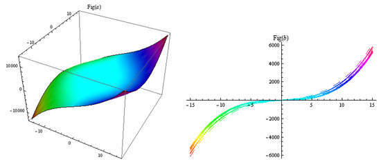 The relation in Equation (75) between and , and is shown in (a,b) (three- and two-dimensional) respectively.