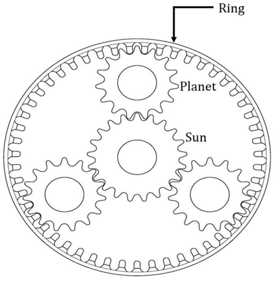 A schematic diagram of a planetary gearbox can be seen in Figure 3 [5]. In the planetary gearbox, there are multiple planet gears simultaneously meshing with the sun and ring gears. The common cause for a planetary gearbox failure is a gear tooth fatigue crack caused by a cyclic load on the gear tooth [6]. The remaining useful life (RUL) prediction of the planetary gearbox can reduce an unnecessary economic loss by replacing the faulty components in advance [7].