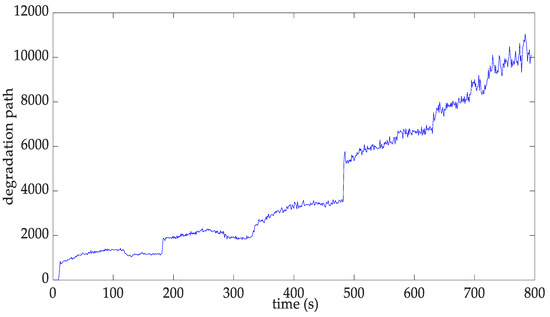 Monotonicity, robustness and tradability values are calculated for these four features, and the results are deposited in Table 1. As we can see from Table 1, the variance is the best feature. Thus, we choose the variance as the degradation path. The variance degradation path is plotted in Figure 10. The VMD algorithm is used to separate the degradation trend and the degradation variation in the degradation path. In Figure 11, the upper subplot is the degradation trend and the lower subplot is the degradation variation.
