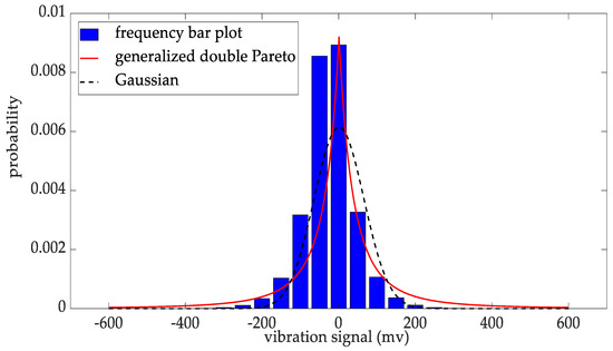The statistical fitting for the test vibration dataset is plotted in Figure 12. As we can see from Figure 12, the generalized double Pareto distribution is more appropriate than the Gaussian distribution for fitting the vibration signal.