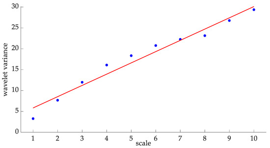 The augmented Dickey–Fuller test confirms the non-stationarity of the degradation trend for the test vibration dataset [40]. Therefore, the wavelet variance approach is used to calculate the Hurst exponent in Figure 13.