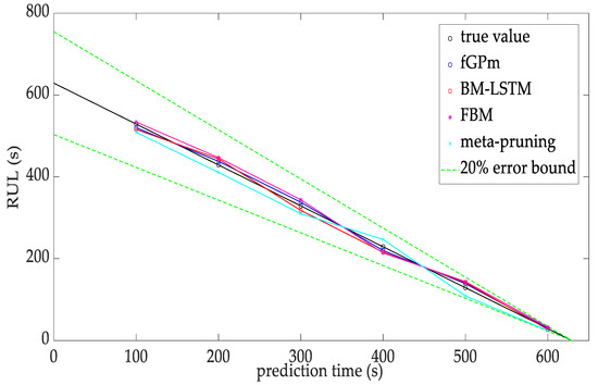 The RUL prediction results based on fGPm are provided in Figure 14, and the model comparison is depicted in Figure 15. The point predictions of different models are plotted in Figure 16. The root mean squared error (RMSE), mean absolute error (MAE) and score of accuracy (SOA) are used to evaluate the prediction accuracy. The standard deviation (std) of the prediction error is also calculated. The evaluation metrics are compiled in Table 2.