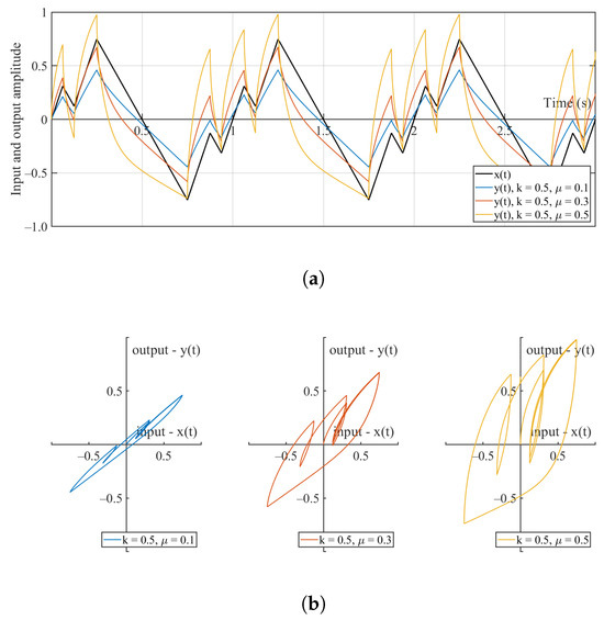 Figure 1a illustrates the time-domain lag of the output of the fractional-order operator concerning the original bidirectional input signal for various values ( = 0.1, 0.3, 0.5). In Figure 1b, the characteristics of the hysteresis loop between input and output are more intuitively reflected. Different combinations of k and values configure such nonlinear relationships. This grants the fractional-order operator a substantial advantage in describing nonlinear behaviors. Based on this advantage, attempts are made to construct a fractional-order nonlinear model.