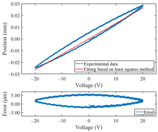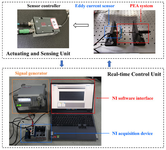 The experimental setup, as illustrated in Figure 14, involves a PEA with model P06.X200AK (nominal stroke: 0∼, nominal displacement: 160 μm , Harbin Zhuanjing Technology Co., Ltd., Harbin, China). The PEA is driven by a voltage amplifier (model E53.C1K, capable of communication with the upper computer). Real-time measurement of its output displacement is conducted using an eddy current displacement sensor (eddyNCDT 3060, Mirco-epsilon Company, Ortenburg, Germany).