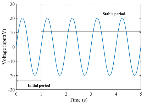 For an actual piezoelectric ceramic actuator system, Figure 2 illustrates the measured hysteresis curve of a PEA driven by a sinusoidal voltage signal with 1 Hz frequency and the input signal presented in Figure 3. The output displacement during the stable period is slightly different from that used in the initial period, attributed partly to loading oscillations and partly to the charge–discharge memory effect of the piezoelectric ceramic material.