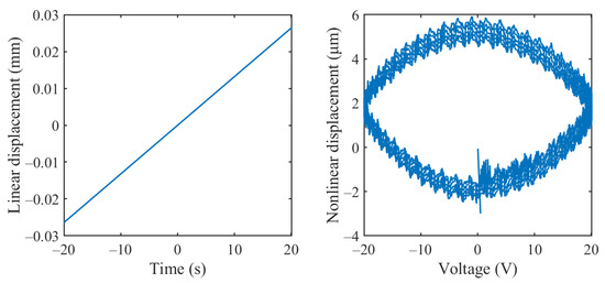 In this study, when considering the line fitted by the least-squares method as the linear component, the hysteresis curve shown in Figure 2 can be decomposed into a linear displacement component and a hysteresis displacement component, as depicted in Figure 4 respectively. Observing Figure 4, it can be noted that the experimentally measured hysteresis curve can be viewed as the superposition of a linear component and a hysteresis component.