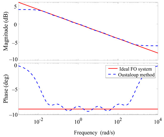 In the more common scenario of engineering implementation, a band-limit implementation is required to compute (where is a fraction), and the frequency range is stipulated as . By employing the Oustaloup recursive algorithm [44], the approximate transfer function as follows: