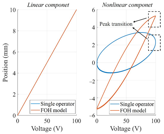 In previous studies on modeling the nonlinear characteristics of piezoelectric materials, a large number of nonlinear hysteresis operators were often employed to describe the hysteresis properties [49]. However, little additional attention was given to the peak transition behavior. The nonlinear component of the model proposed in this work is based on a combination of a fractional-order operators and a deformed form of another fractional-order operator, achieving a good representation of the peak transition behavior. Figure 9 demonstrates that the nonlinear module of the FOH model provides a better representation of this characteristic compared to a single fractional-order operator.