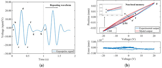 To provide an intuitive correspondence between input and output, corresponding points are marked in Figure 10a,b. Notably, in Figure 10b, points c and e, as well as g and h, are very close but different, and only one position is marked for each pair. It can be observed that the large hysteresis loop in the segments of the model output exhibits the characteristics of piezo lag. Meanwhile, in segments and , with equal input peak values, the displacement output is related to the historical inputs a and e, respectively, demonstrating different output values. This illustrates the dependence of the system output on the historical inputs for the same input, i.e., non-local memory. Despite the presence of errors between the model output and the experimental output, in terms of feature representation, this consistency in the experimental and simulated results in Figure 10 verifies the FOH model’s ability to predict and describe this phenomenon.