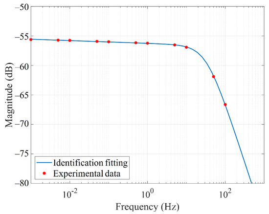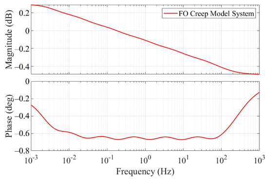 Turning to the frequency domain, the fractional-order creep model exhibits noteworthy features. With an increase in frequency, the phase of the model remains constant, accompanied by a consistent decrease in magnitude. Figure 12 presents the Bode diagram of the fractional-order model, bearing a resemblance to the Oustaloup implementation. The chosen frequency range for analysis is (0.01 Hz, 100 Hz). Remarkably, the phase–frequency curve of the proposed model assumes a distinct horizontal line shape, maintaining a constant phase of deg. This alignment with the phase characteristics observed in the piezoelectric creep effect enhances the model’s significance in capturing and representing relevant physical phenomena.
