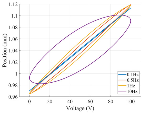Figure 13 visually encapsulates the features of the coupled model. Notably, the hysteresis curves exhibit distortion owing to the frequency-dependent attenuation of the fractional-order creep magnitude. As depicted, the output displacement amplitude experiences a discernible reduction with the continuous increase in input signal frequency post the 1 Hz threshold. This observed phenomenon impeccably aligns with the amplitude–frequency characteristics of the creep model. The discernible decrease in output displacement amplitude as the input signal frequency rises beyond 1 Hz corroborates the consistent representation of creep effects by the coupled model. This noteworthy alignment substantiates the coupled model’s capacity not only to capture the hysteresis effect but also to faithfully represent the intricacies of the creep phenomenon.