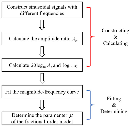 where s represents the Laplace operator, and and correspond to the Laplace transformations of and , respectively. The obtained frequency-domain amplitude spectrum of the system is then fitted to the experimental creep amplitude–frequency data, as depicted in Figure 17. Subsequently, the creep parameter is determined, marking the completion of the fractional-order creep model identification process.