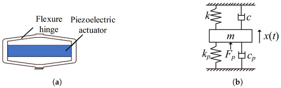 where m represents the equal mass of the PEA, denotes the displacement output of the PEA, and c and represent the damping coefficients associated with the flexure hinge and the piezo stack, respectively. Additionally, k and represent the equal stiffness of the hinge and the piezo stack, respectively.