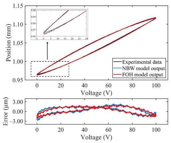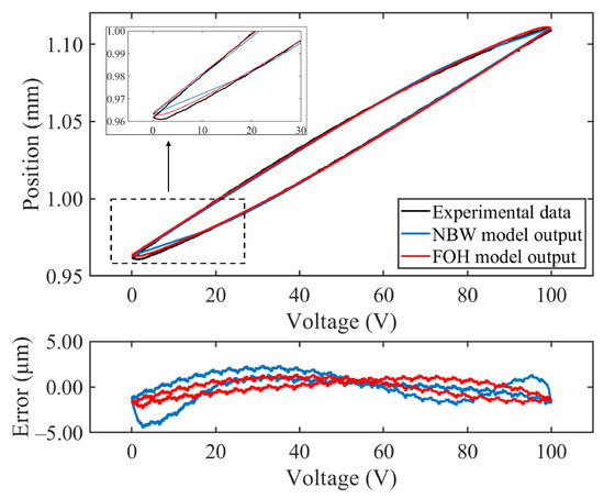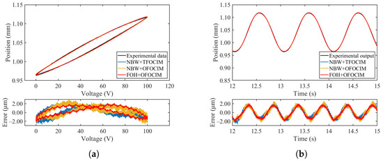 As [52] reported, this NBW model can accurately describe the rate-independent properties of piezoelectric hysteresis. Figure 18 and Figure 19 also show the corresponding fitting results and prediction errors for the comparison. Quantitatively, Table 3 lists the of the FOH model and the NBW model of the experimental PEA system. It can be seen that, when compared with the NBW model, the FOH model outperforms it in the static piezoelectric hysteresis loop under different input conditions. In the sinusoidal case, the model’s accuracy improves by 7.3%; with the triangular wave input, the tracking accuracy improves by 33.569%.
