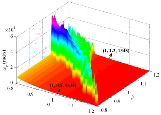 (5) From Table 1 and Figure 5, it is evident that when remains constant, and varies, the gain crossover frequency remains relatively constant, except when . For example, when the combinations of and are and , the gain crossover frequencies are nearly identical, specifically 1334 rad/s and 1345 rad/s, respectively. Furthermore, when approaches 2, there is a resonance in the magnitude-frequency characteristics of a fractional-order LCL filter, resulting in a sudden increase in the gain crossover frequency. Similarly, Table 2 and Figure 6 show that when remains constant and varies, the gain crossover frequency gradually increases as decreases, except when . These simulation results generally align with the observations presented in Figure 5.