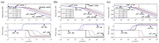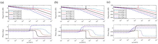 The frequency characteristic curves of a fractional-order LCL Filter when is constant and changes. (a) The frequency characteristics when . (b) The frequency characteristics when . (c) The frequency characteristics when .