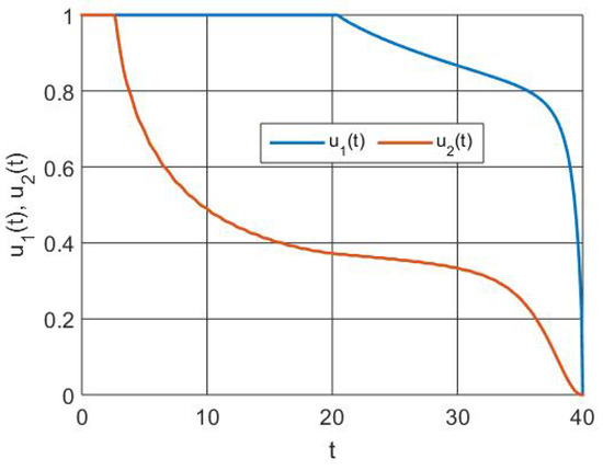 Numerical simulation depicts the qualitative behavior of the dynamical system. The solution of the fractional optimal control is solved using the MATLAB code described in [33]. Moreover, variables’ initial size and parameters values are given subsequently. , .