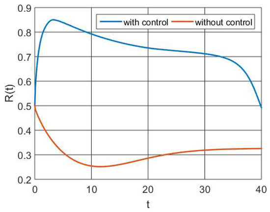 The regenerated population size is shown in Figure 6 with and without control treatments. It demonstrates that effective optimal controls during intervention enhance the frequency of people recovering from RSV with immunity. However, if a population loses its immunity, it becomes smaller.