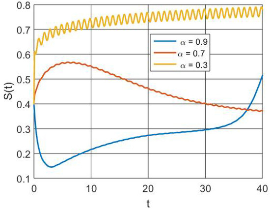 Simulation of susceptible population dynamics with different orders of derivatives.