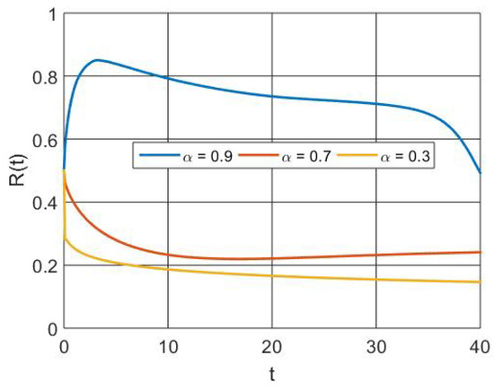 Using the Caputo fractional mean value theorem, we obtain , . Therefore, using the preceding equation, we obtain , which is a contradiction to our earlier assumptions for . Therefore, any solution is non-negative for all . Similarly, all solution variables are non-negative for all . Therefore, the solution of the constructed model is non-negative.
