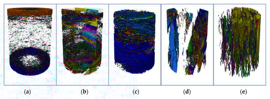 Three-dimensional CT reconstructed images of (a) DQ1, (b) DQ2, (c) DQ3, (d) DQ4, (e) DQ5 (The different colors in the figure represent different pores).