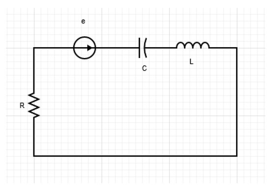 We examine the fractional linear circuit depicted in Figure 1 below, where we have a specified resistance, R, capacitance, C, inductance, L, and a voltage source, e [37]. Using (67), (69) and the second Kirchhoff’s law, the following state equation is derived
