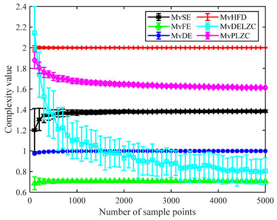 From Figure 3, as the length of the number of samples increased, the trend in the complexity of all the metrics could be seen, with MvDE and MvFE increasing first and then remaining unchanged, MvDELZC and MvPLZC continuing to decrease, and MvHFD always remaining the same. The complexity values of all the metrics were stable for sample lengths greater than 3000 sample points; at sample lengths greater than 1000, the complexity of MvPLZC and MvDELZC decreased with increasing sample length, and the complexity values of the remaining metrics held essentially constant as the sample length increased. It can be concluded that compared to the remaining metrics, MvFE and MvHFD had the most stable complexity values with increasing sample length.