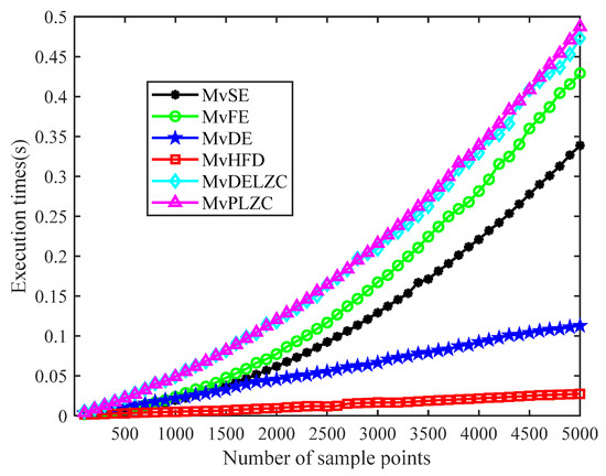From Figure 4, it can be observed that the execution times of all the metrics increased with the increase of sample length; among them, the computation time of MvHFD was always the smallest. Additionally, MvDELZC and MvPLZC had the highest computing cost. For the metrics of MvSE, MvFE and MvDE, the computation time of the three methods was basically the same when the number of samples was less than 1500; when the number of samples was more than 1500, MvFE was the slowest and MvDE was the fastest. Therefore, it can be concluded that compared with other metrics, MvHFD had the shortest calculation time and the highest efficiency under the same sample point length.