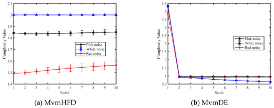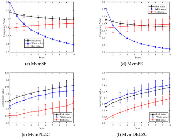 Pink noise, white noise, and red noise are used in this section to test the capability of the proposed metrics for discriminating signals. There were three channels for each signal, where 204,800 sample points were obtained for every channel and 100 samples were used with an overlap rate of 0; each sample had 2048 sample points. Figure 5 shows the mean and standard deviation of the complexity of the six metrics, including the MvmHFD, MvmDE, MvmSE, MvmSE, MvmFE, multivariate permutation Lempel–Ziv complexity (MvmPLZC), and multivariate multiscale dispersion entropy Lempel–Ziv complexity (MvmDELZC) for three noise signals at ten scales.