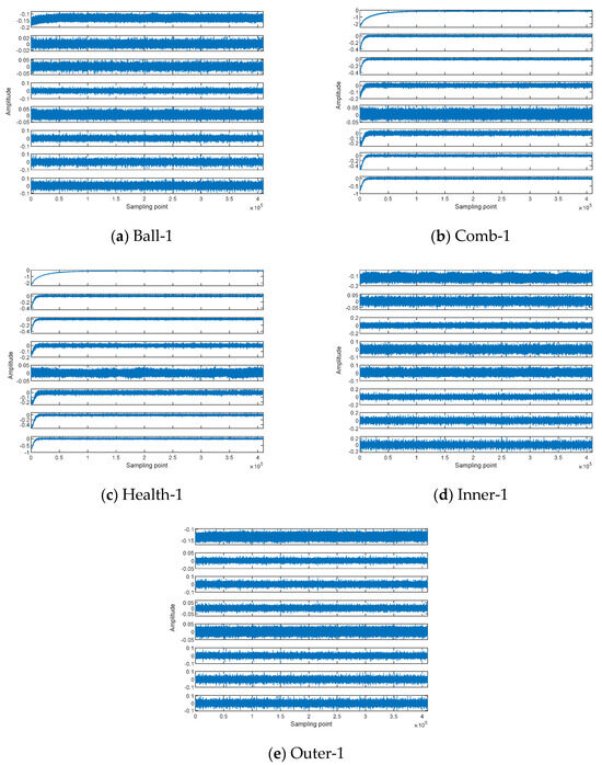 The bearing signal data used in this section included the ball fault, combination fault, health state, inner ring fault and outer ring fault, all of which are eight-channel bearing signals. We named these signals Ball-1, Comb-1, Health-1, Inner-1, and Outer-1. Each channel was selected for the first 409,600 sampling points, which were evenly divided into 200 samples without overlapping parts, with each sample containing 2048 sampling points. Figure 6 shows the eight-channel time-domain waveforms for the five bearing signals, and each sub-figure shows channels one to eight from top to bottom.
