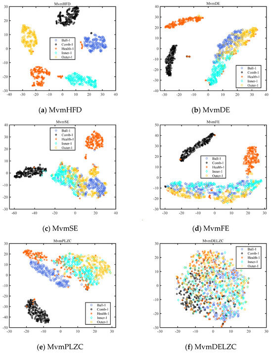 To visualize the ability of this metric to distinguish bearing signals, t-Distributed Stochastic Neighbor Embedding (T-SNE) [33] was utilized to demonstrate the feature distribution, which is able to map 10-dimensional data onto a 2-dimensional plane. The 10-dimensional data of T-SNE represents the complexity features of bearing signals at ten different scales. Figure 7 illustrates the T-SNE map of the six metrics for the five bearing fault signals.