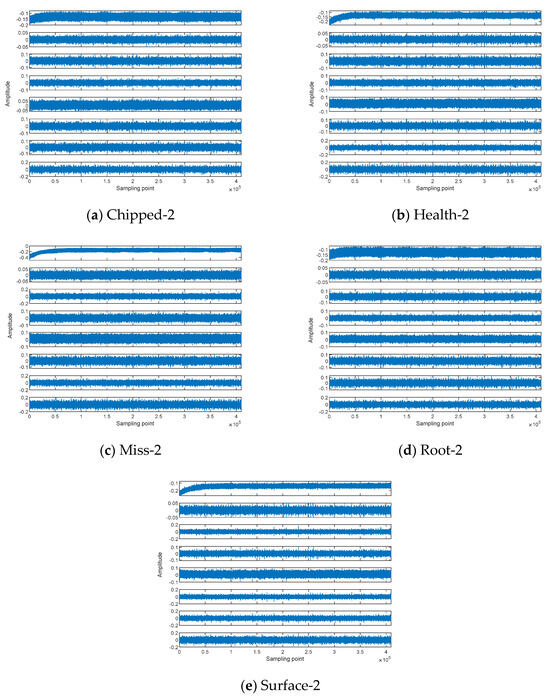 The gear signals used in this section included the chipped fault, health state, miss fault, root fault and surface fault, covering all eight channels of data. These signals were named Chipped-2, Health-2, Miss-2, Root-2, and Surface-2. The data selection for each channel was the same as in Section 4.1, and Figure 8 shows the eight-channel time-domain waveforms for the five gear signals.