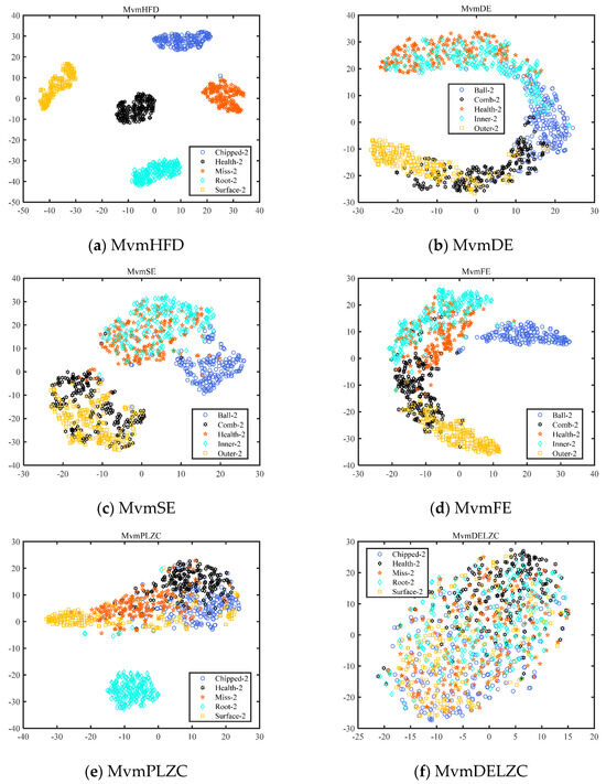 As in Section 4.1, we used T-SNE to map 10-dimensional data onto a 2-dimensional plane; the 10-dimensional data represents the complexity features of gear signals at ten different scales. Figure 9 illustrates the T-SNE map of the six metrics for the five gear signals.