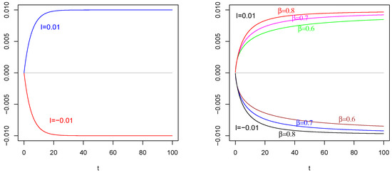 In left side of Figure 1, we plot the mean of the input process as in (23) with , , for two values of current term The red curve corresponds to an inhibitory current term , and the blue curve corresponds to an excitatory current term Take into account the increasing (decreasing) behavior on time of the input correlated process on the consequent change in the behavior of (in Figure 2) and (in Figure 3).
