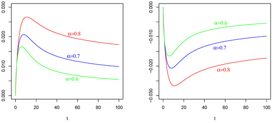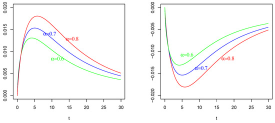 The mean functions of processes , and are plotted in Figure 2, Figure 3 and Figure 4, respectively, with all values of parameters as in Table 1. Specifically, we implemented R-scripts to obtain the plots of formulae (31), (41) and (54) for , and , respectively. For the numerical evaluation of Mittag–Leffler functions, we uploaded the R-package and used R-function for integral evaluations and vectorized for evaluating double integrals.