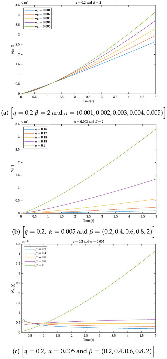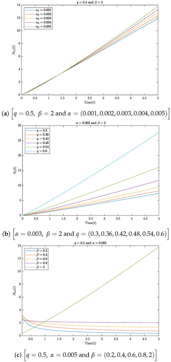 In this section, we offer a graphical elucidation of the determined results with different values for the parameters in Equations (71) and (73). Figure 1 and Figure 2 are the visual representations of Equations (71) and (73), respectively, using the parameters , and In Figure 1a and Figure 2a, we fix the values of q and and drew graphs for different values of . In Figure 1b and Figure 2b, we set the values of and q and drew plots for different values of In Figure 1c and Figure 2c, we fixed the values of and and drew graphs for different q values. All the different values for the parameters were chosen according to the conditions of convergence of the functions in Equations (33) and (34). Furthermore, we could obtain several results from the graphical solutions to Equations (71) and (73) by selecting different values for and q that satisfied convergence of the functions in Equations (33) and (34).