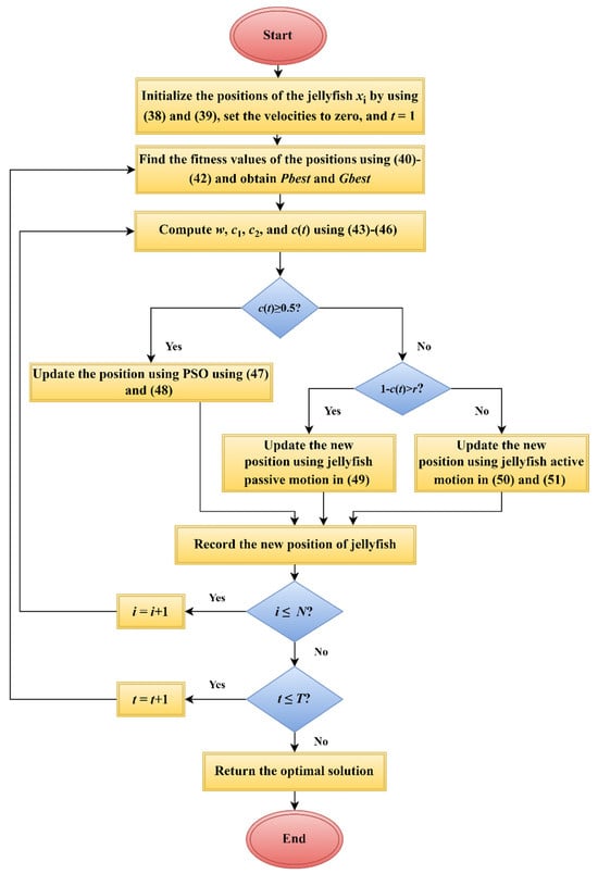 The HJSPSO is a hybrid algorithm that takes advantage of the exploitation ability of the jellyfish optimizer (JO) [38], in addition to the exploration merit of the particle swarm optimization algorithm (PSO) [39]. The tuning process alternates between the two algorithms using a time control technique to find the finest solution. Moreover, the hybrid algorithm includes several coefficients that achieve consistency between exploitation and exploration. The hybrid algorithm flowchart is illustrated in Figure 3.